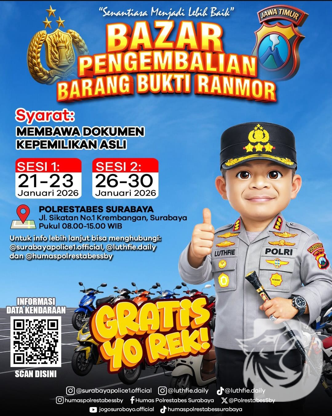 Detiknews.id Surabaya – Kapolrestabes Surabaya, Kombes Pol Luthfie Sulistiawan S.I.K, M.H, M.Si, menegaskan Bazar Ranmor akan dibuka besok. Sejumlah 800 motor, akan dikembalikan secara gratis kepada pemiliknya. Pelaksanaan Bazar Ranmor akan digelar dua sesi. Yaitu, sesi pertama tanggal 21–23 Januari 2026 dan sesi kedua tanggal 26–30 Januari 2026. Kegiatan berada di Mapolrestabes Surabaya.