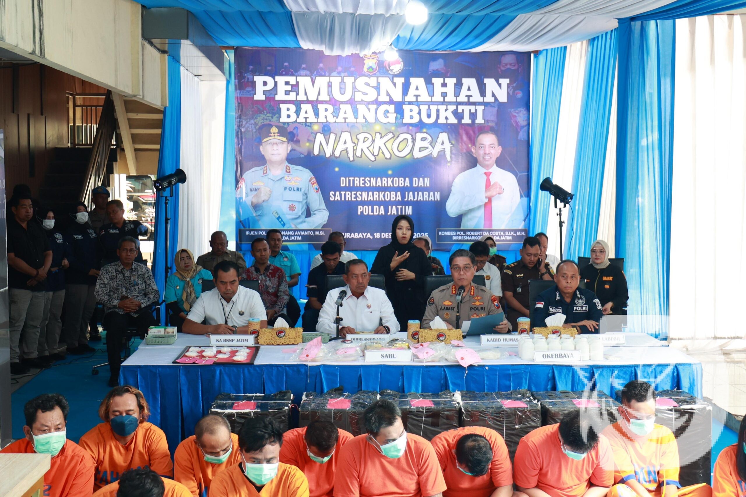 Ia juga menjelaskan, bahwa pemusnahan barang bukti narkoba telah dilakukan beberapa kali sepanjang tahun 2025. Pada Juni 2025, Polda Jatim memusnahkan 49 kg sabu dan 2.860 butir ekstasi, serta 5.688.600 butir obat keras. Selain itu, pemusnahan bersama Bareskrim Polri juga dilakukan terhadap 85,3 kg sabu.