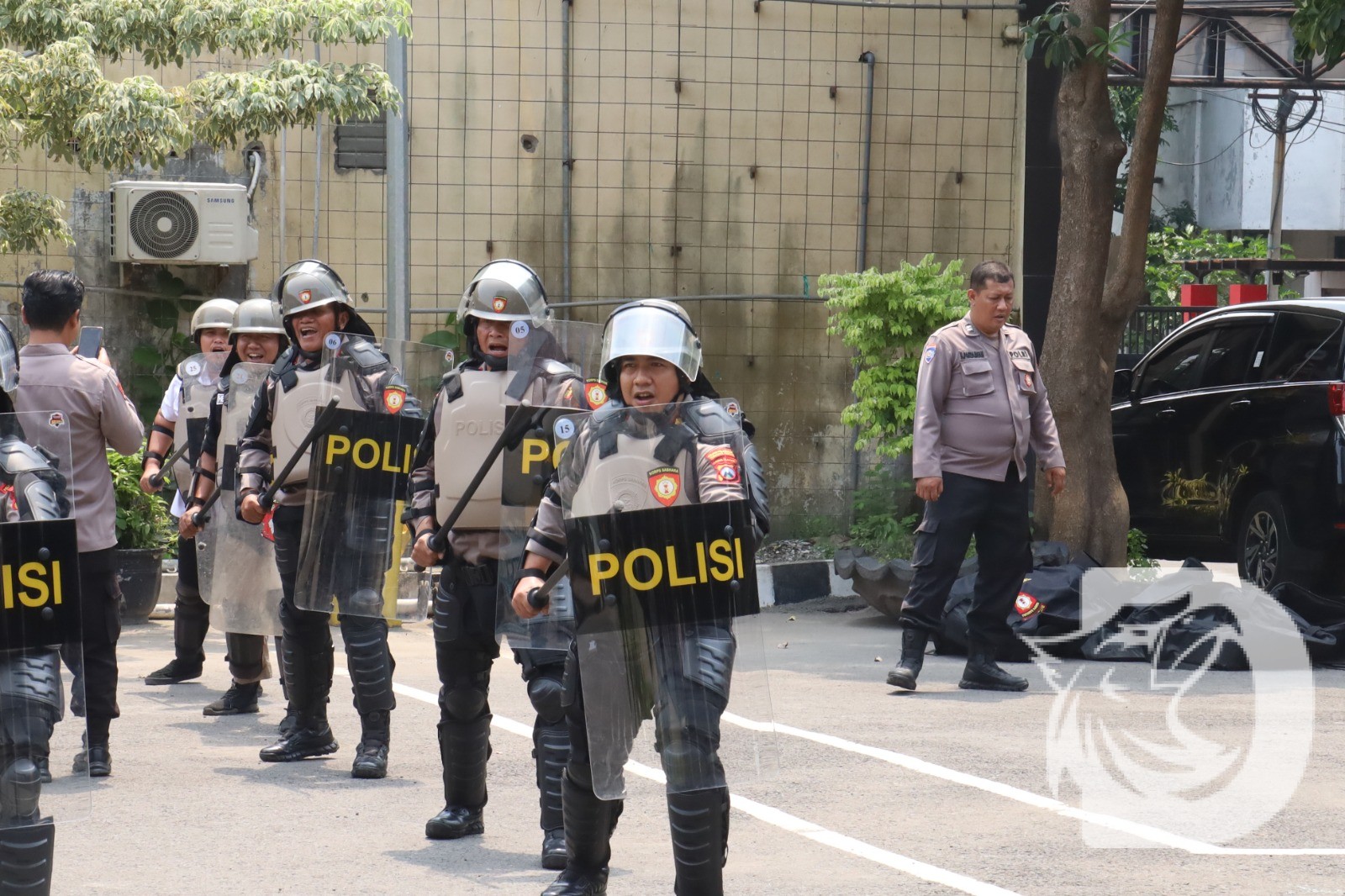 Bukan sekadar peninjauan, AKBP Wahyu Hidayat ikut membaur, mengangkat tameng, dan melakukan simulasi formasi pengamanan massa.