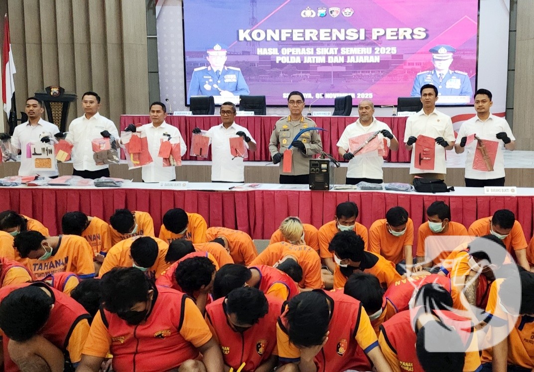 “Operasi Sikat Semeru 2025 bertujuan untuk menekan dan memberantas berbagai tindak kejahatan yang meresahkan masyarakat,” ujar Dirreskrimum Polda Jatim Kombes Pol Widi Atmoko, didampingi Kabid Humas Kombes Pol Jules Abraham Abast, saat konferensi pers di Mapolda Jatim, Rabu sore (5/11).