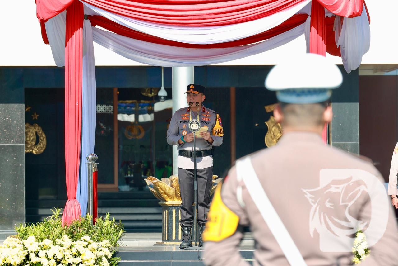 Apel dipimpin Wakapolda Jatim Brigjen Pol. Dr. Pasma Royce, S.I.K., M.H yang membacakan amanat Kapolda Jatim Irjen Pol Drs. Nanang Avianto, M.Si di Lapangan Mapolda Jatim, Senin (02/02/26).