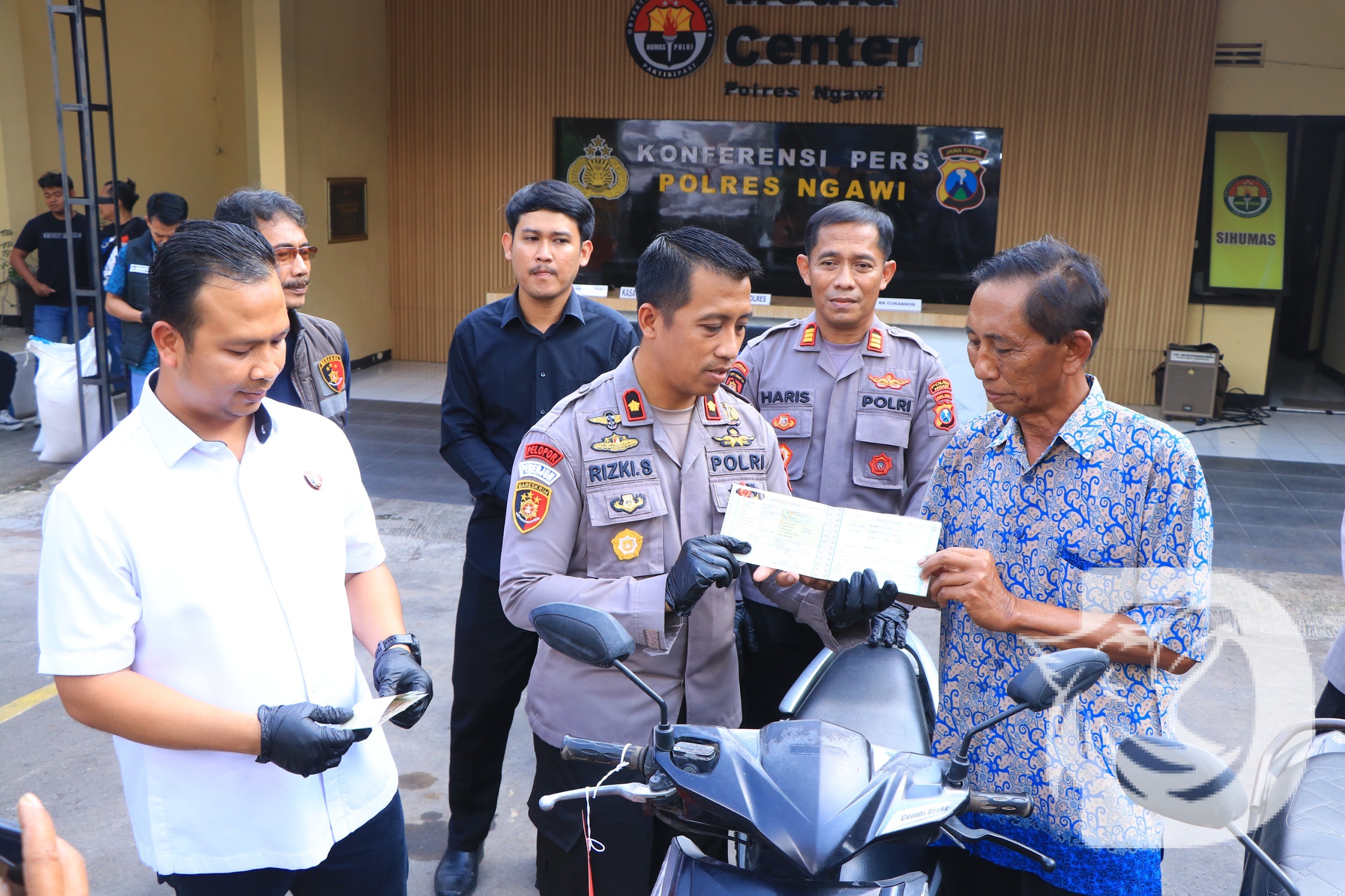 Setelah berhasil mengamankan tersangka dan menemukan kendaraan yang dilaporkan hilang, Wakapolres Ngawi Kompol Rizki Santoso, S.I.K yang didampingi Kasatreskrim Polres Ngawi AKP Aris Gunadi, S.H secara resmi menyerahkan barang bukti kepada para pemiliknya.