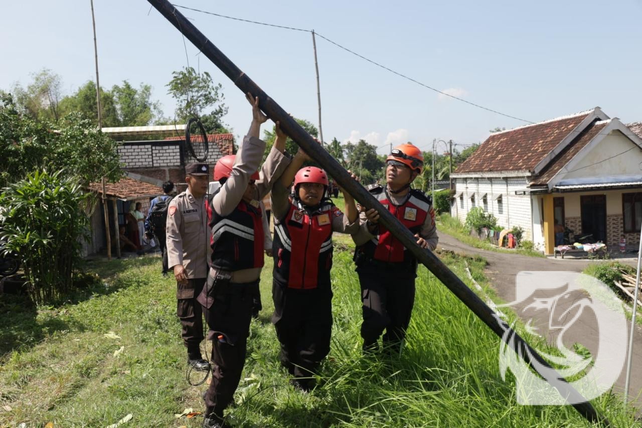 Puluhan personel Polres Tuban bersama BPBD dan unsur terkait langsung terjun ke lokasi untuk membantu proses evakuasi, pembersihan puing-puing bangunan, serta membantu warga membersihkan pohon yang mengganggu akses jalan.