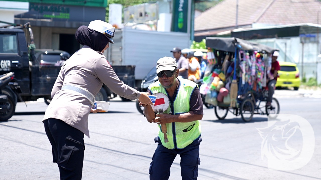Di salah satu sudut jalan, seorang pedagang keliling tampak berhenti sejenak ketika dihampiri seorang Polwan yang menyodorkan paket makanan sambil tersenyum ramah. “Terima kasih, Bu. Rezeki hari ini,” ujarnya.