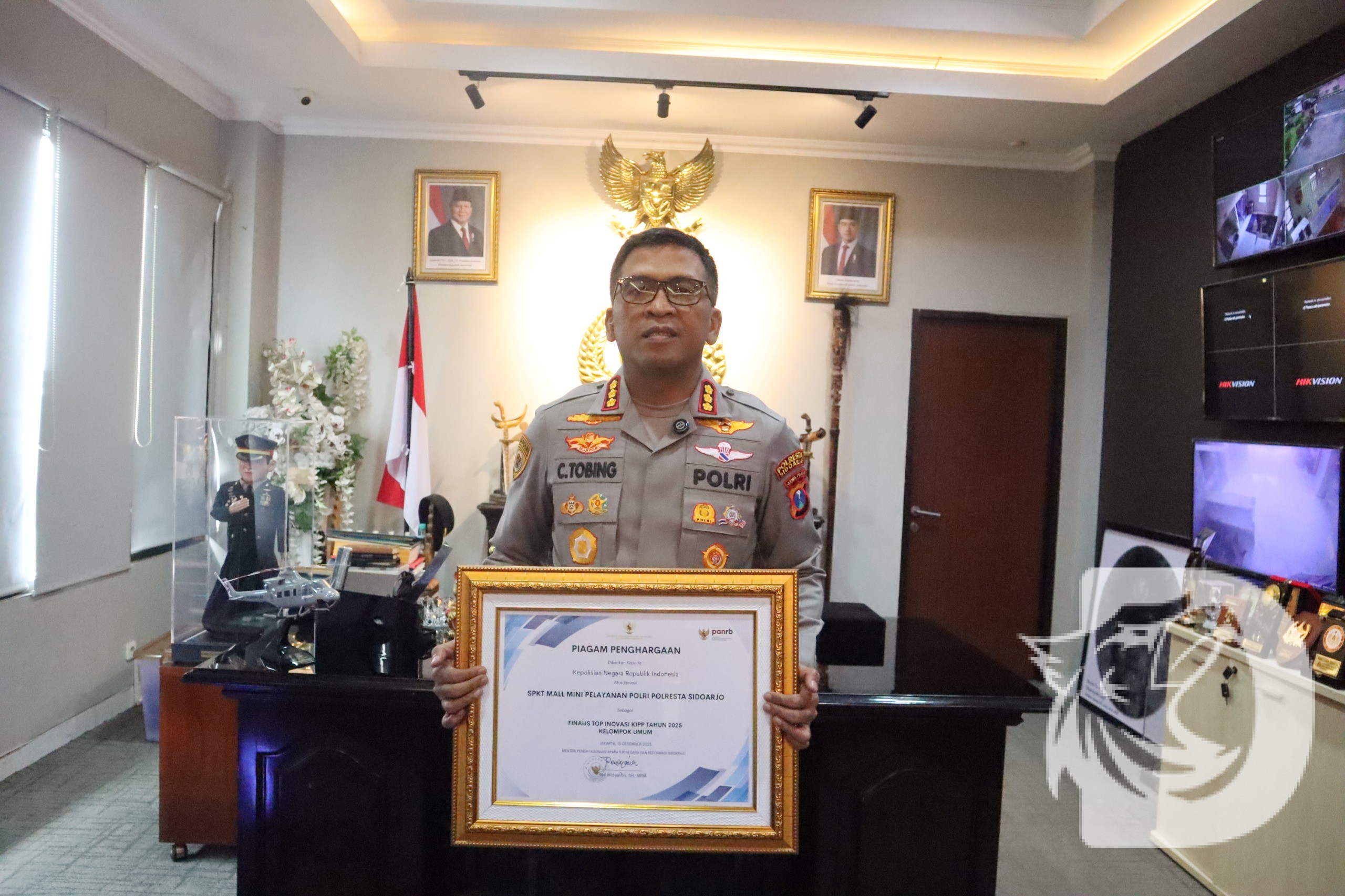 Kapolresta Sidoarjo Kombes. Pol. Christian Tobing, mengucapkan terima kasih atas diberikannya penghargaan dari Menteri PANRB atas inovasi SPKT Mall Mini Pelayanan Polri Polresta Sidoarjo, sebagai Finalis Top Inovasi KIPP tahun 2025 Kelompok Umum.