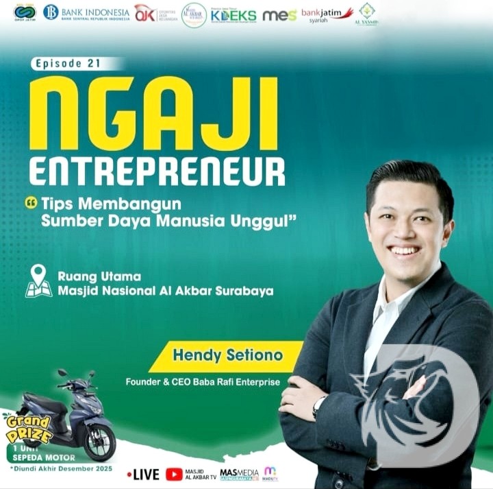 Detiknews.id SurabayaHendy Setiono, Founder & CEO Baba Rafi Enterprise, hadir di Masjid Nasional Al Akbar Surabaya. Menjadi pusat penguatan ekonomi umat, melalui Ngaji Entrepreneur Episode 21. Membagikan strategi membangun Sumber Daya Manusia (SDM) unggul. Sebagai kunci utama, agar UMKM Indonesia mampu bersaing di pasar global.