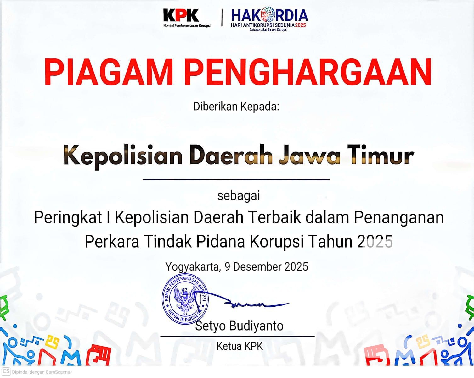 “Penghargaan ini menjadi bukti komitmen dan integritas jajaran Polda Jawa Timur dalam pemberantasan korupsi serta menjadi teladan bagi daerah lain. Semoga capaian ini semakin memotivasi untuk terus bekerja profesional, transparan, dan berani demi mewujudkan Indonesia yang bersih dari korupsi”.